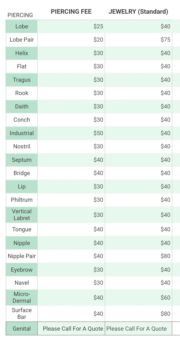 Piercing pricing is broken up into 2 parts: a $20 - $50 piercing fee, varying on the complexity of the piercing, and the cost of jewelry. Because the final price is determined by the jewelry you choose, prices will vary.